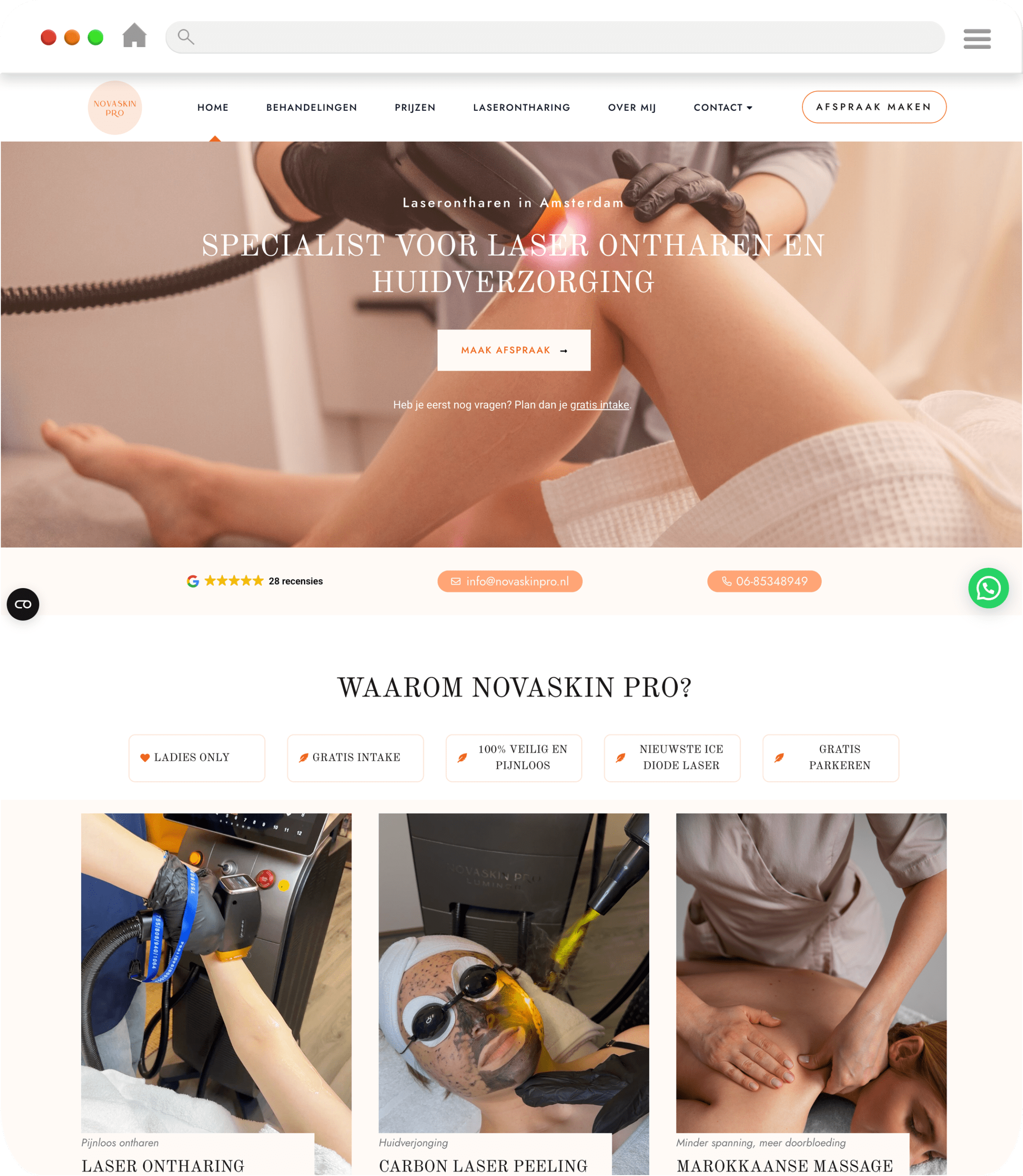 Voor NovaSkin Pro hebben we de vindbaarheid op “laser ontharen” en lokale zoekopdrachten in Amsterdam structureel verbeterd. Deze resultaten zijn gemeten via SE Ranking (Google NL • Amsterdam) en laten sterke zichtbaarheid zien op zowel brede als lokale money-keywords.